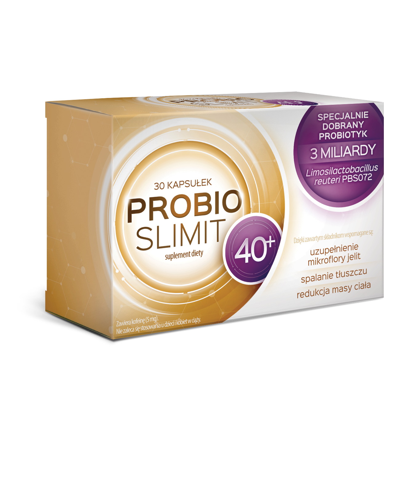 Suplement diety Probioslimit 40+ został stworzony z myślą o osobach po 40 roku życia chcącym wesprzeć proces odchudzania (dzięki wyciągowi z nasion koli błyszczącej). Zawiera specjalnie dobrany szczep bakterii probiotycznych Limosilactobacillus reuteri PBS072 w celu uzupełniania mikroflory jelit oraz składniki wspierające spalanie tłuszczu (wyciąg z nasion koli błyszczącej) i redukcję masy ciała (wyciąg z owocu opuncji figowej).